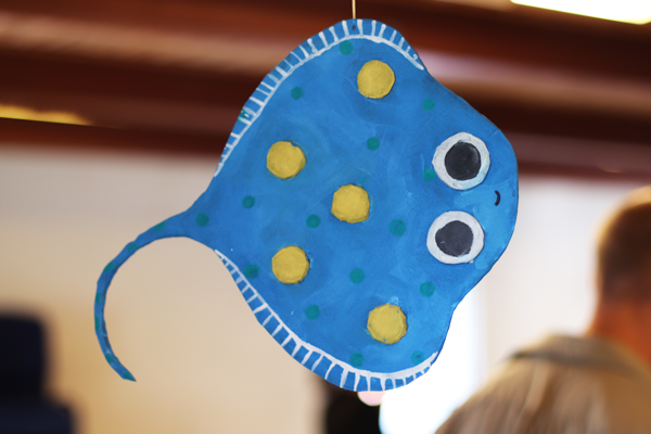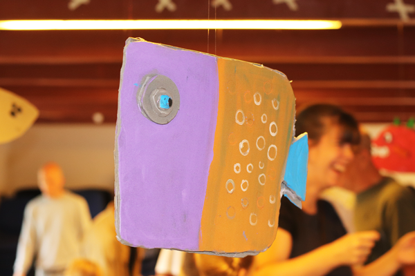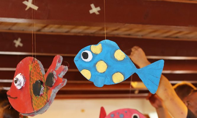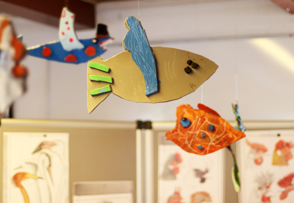 Eleverne kastede sig ud i vores kreative arbejde med temaet ‘Fugl, fisk og midt imellem’ inspireret af gemmelegen med samme titel og med et udvalg af anderledes materialer som liggeunderlag, Oasis blomster, skum og manifold papir.